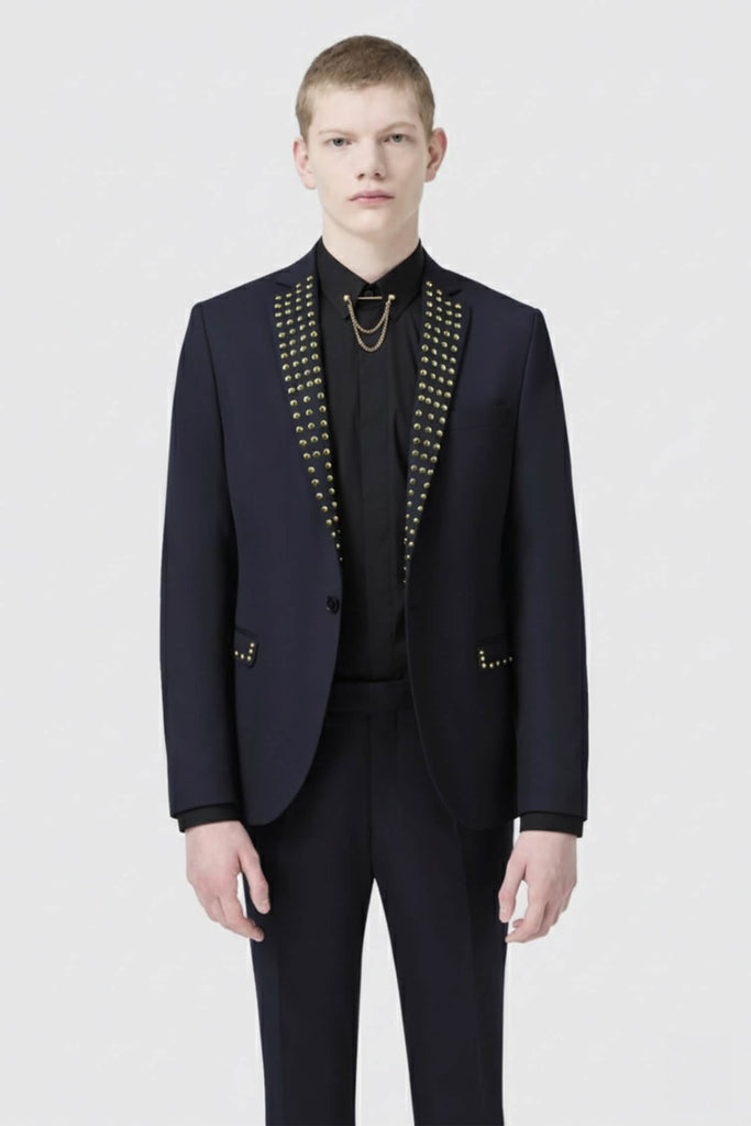 • Lapel and pockets trimmed with gunmetal studs