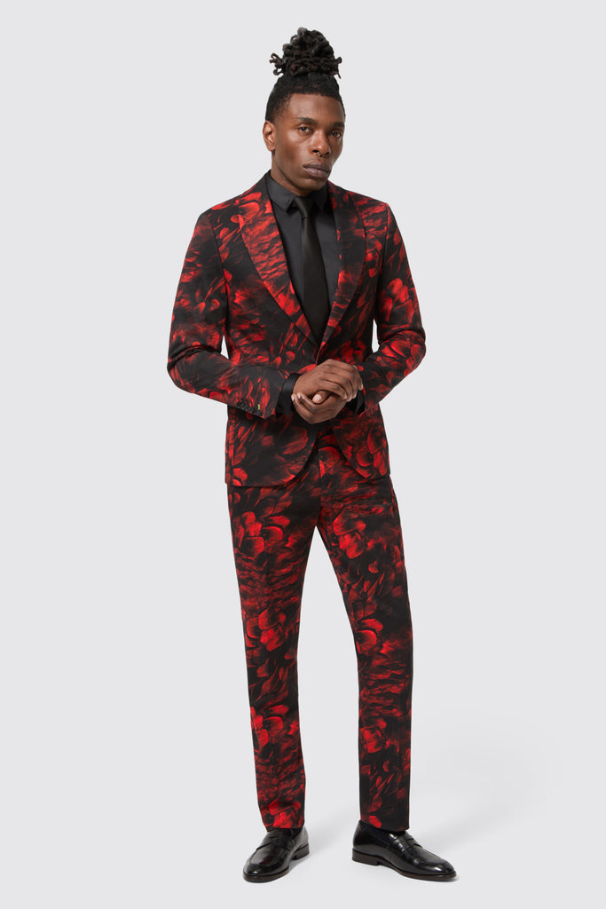 The classical detailing combined with the all-over floral flocking makes the Heron red suit a standout piece for any and all occasions. The jacket features a single button closure with a shawl lapel and jet pockets. The red floral motif all over adds a bold twist to classic tailoring. The trousers feature a flat front with slanted pockets, slanted belt loops and a slim waistband. Style the trousers with the matching skinny fit suit jacket for an opulent approach to formal-wear.