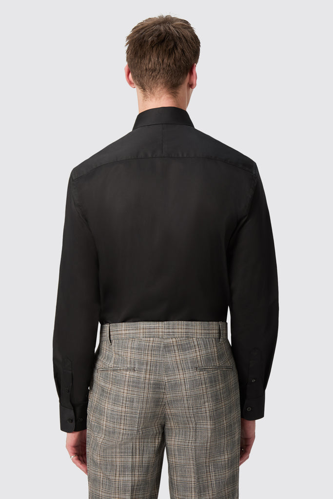 Enhance your wardrobe with the Asmara black sateen cotton shirt and enjoy the perfect blend of luxury, comfort, and timeless style. The Asmara shirt is the latest addition to the Without Prejudice collection and offers a timeless appeal. A sateen shirt offers a touch of luxury and sophistication, remaining stylish season after season and suitable for various occasions. The shirt features a regular collar, single cuff and is cut to a slim fit. Perfect for both formal events and upscale casual settings. Pair the Asmara shirt with a suit for a distinguished look or with tailored trousers for a smart, relaxed style.