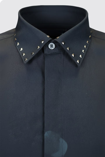 The Sember Shirt brings refined minimalism with a rebellious twist - a clean black silhouette elevated by gunmetal studs along the collar for a sharp, statement finish.