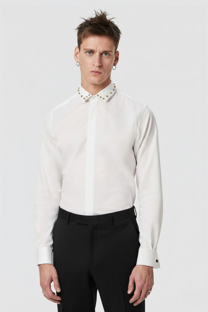 The Leigh Shirt redefines classic occasionwear. A crisp double cuff style elevated with gold studs around the collar for a sleek, rebellious finish.