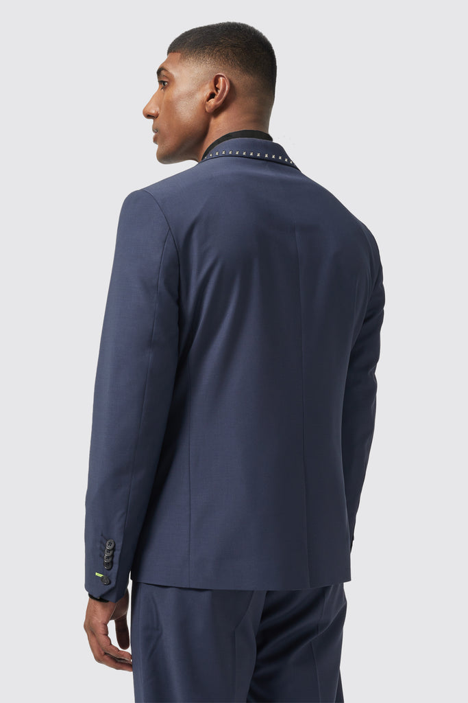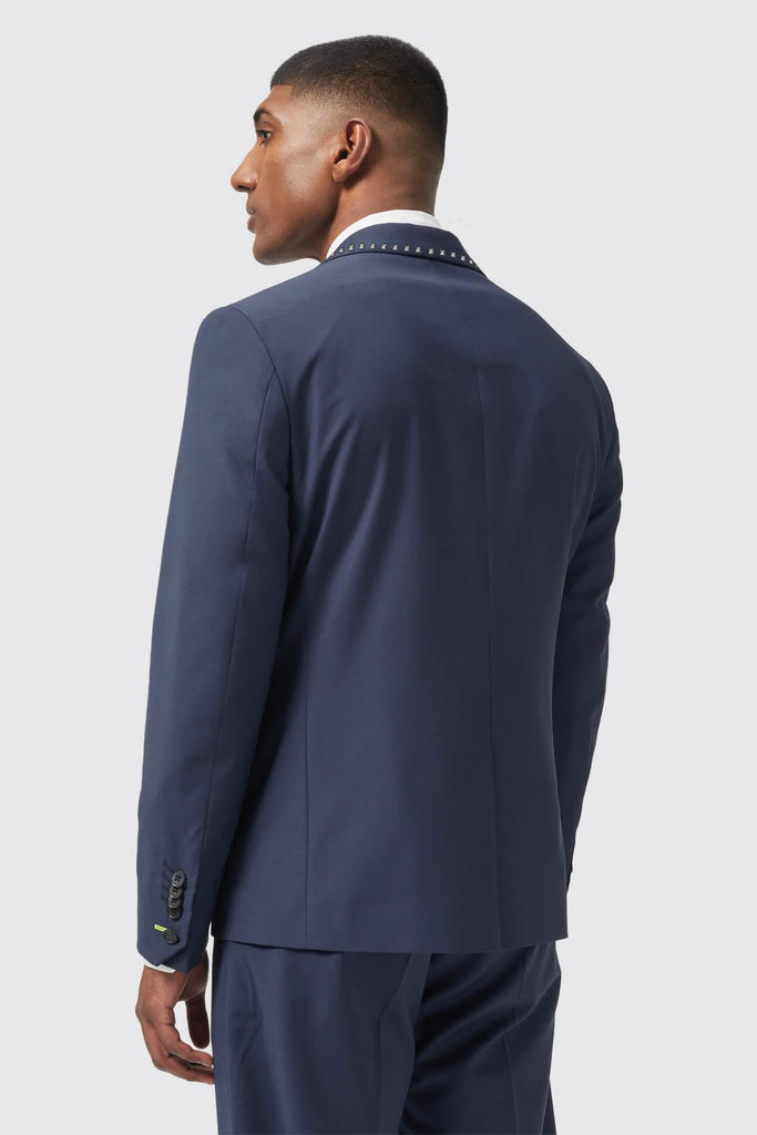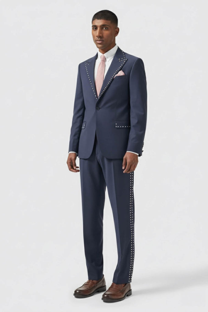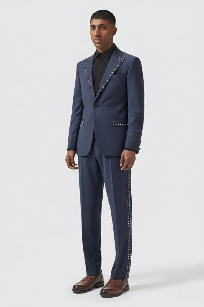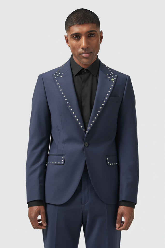 The Carson Dark Navy Suit combines classic British tailoring with a punk edge, featuring gunmetal stud detailing across the lapel and pockets for a bold, elevated finish.