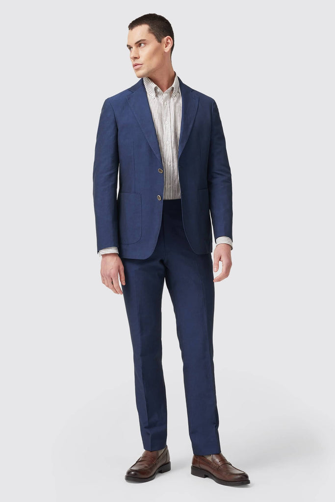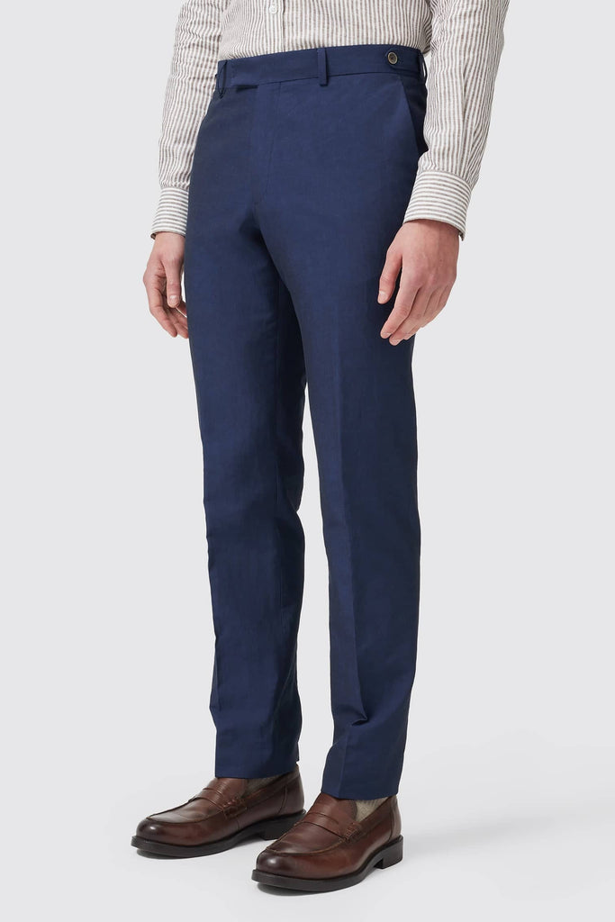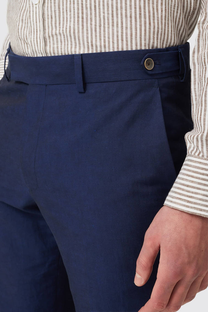 The Barnham in Navy from Richard James Mayfair is the Summer suit you have been looking for. Crafted from a 50/50 blend of cotton & linen out in Italian mills, this 2 piece will add some luxury to your wardrobe. The Barnham trousers feature a french bearer with 2 clips, slated side pockets, 6 straight belt loops on the waistband with side adjustors - so you can make sure they fit just right. Wear as a two piece with a linen shirt for a complete Summery sharp look.