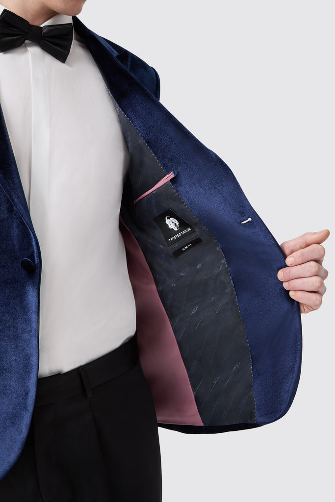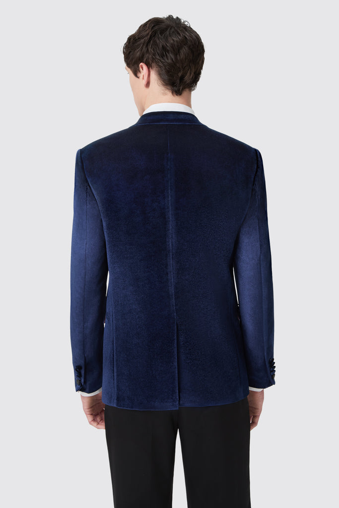 The Bloomfield Peak Slim Velvet Blazer in navy offers refined elegance with a modern twist. Featuring an 8cm single breasted closure and peak lapel, it creates a sharp, sophisticated silhouette. The straight flap pockets, with a 4cm depth, and the outer breast welt pocket provide both style and practicality. A single dart ensures a tailored fit, while the mitered cuffs with five buttons—including a standout skull button with a rose buttonhole—add a unique touch. The remaining buttons feature slanted tonal buttonholes, completing the blazer’s luxurious finish. Pair the blazer with a crisp white shirt, bow tie and black suit trousers to complete the full look.