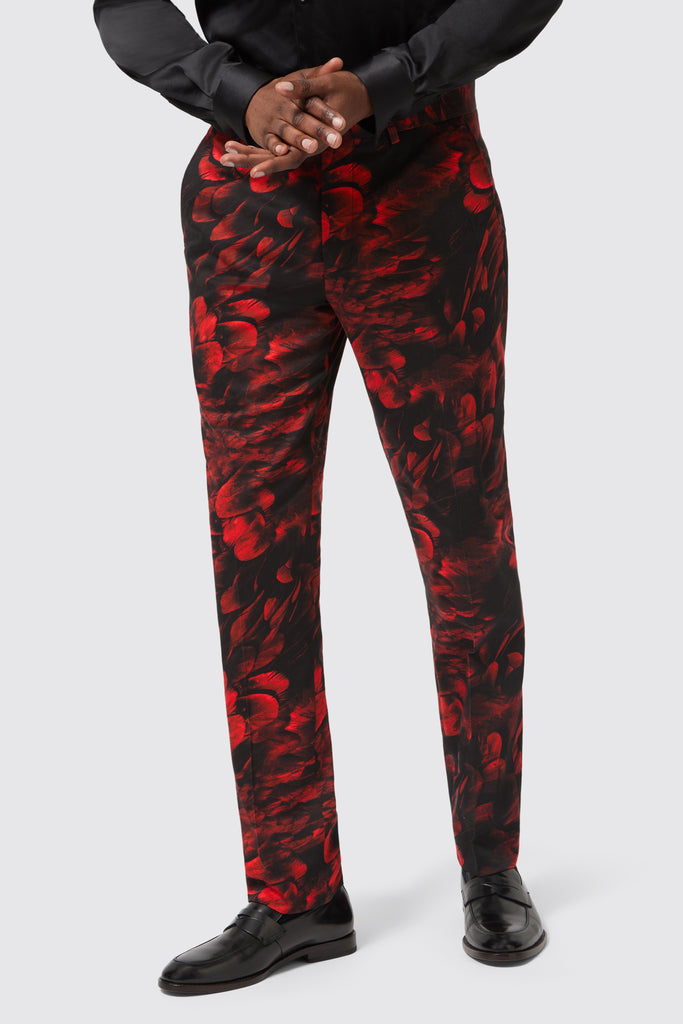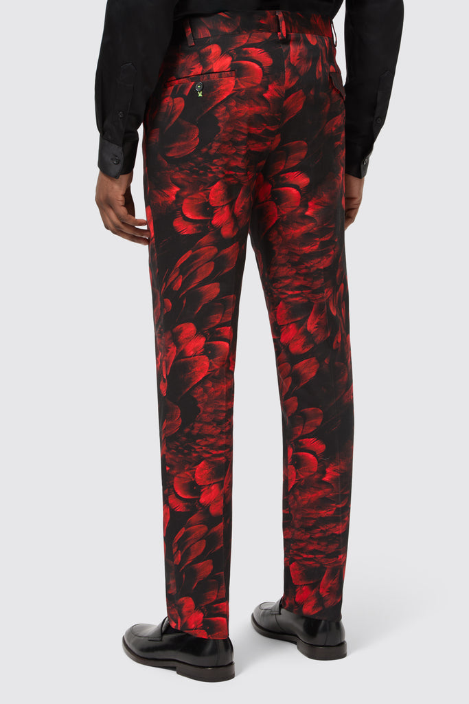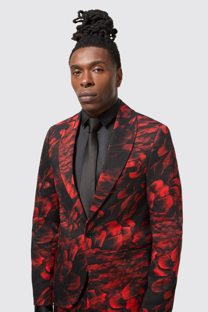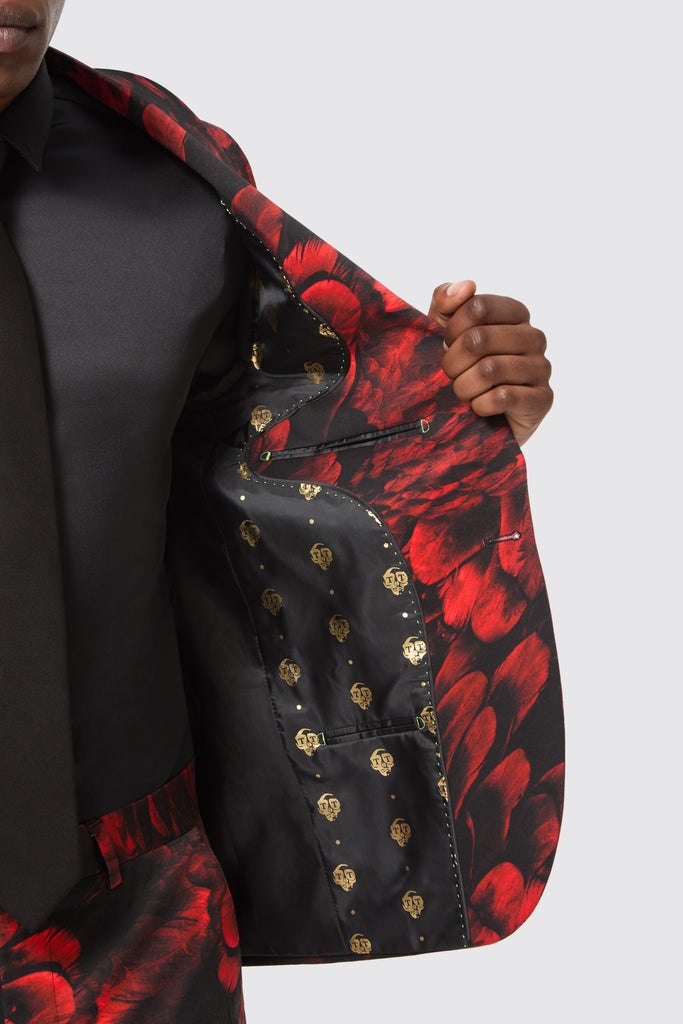 The classical detailing combined with the all-over floral flocking makes the Heron red suit jacket a standout piece for any and all occasions. The jacket features a single button closure with a shawl lapel and jet pockets. The red floral motif all over adds a bold twist to classic tailoring. Style the jacket with the matching skinny fit suit trousers for an opulent approach to formal-wear.