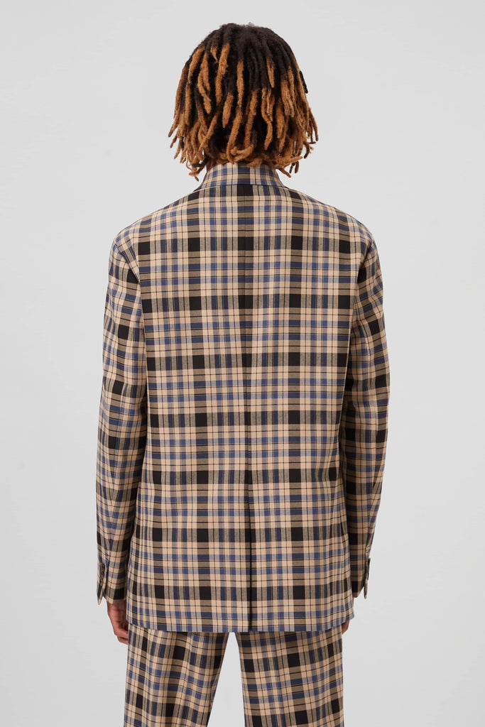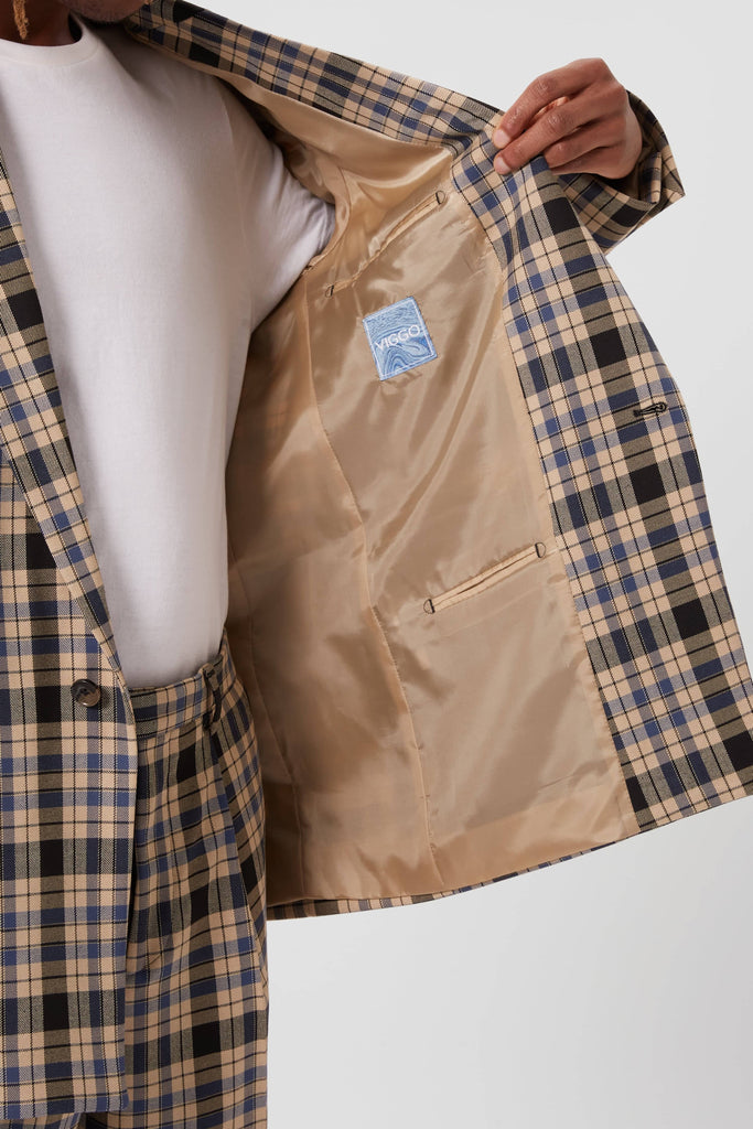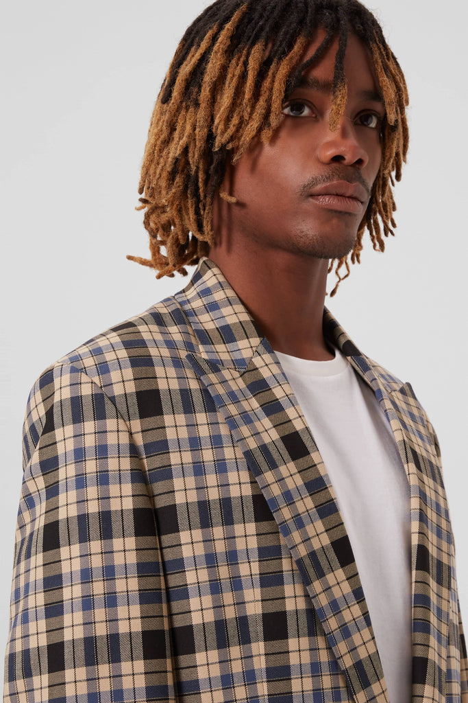 The Digne suit from VIGGO is made from a slick blue, black & beige check fabric. The jacket features a peak lapel with a concealed button closure on the front, single front darts, single read bent and straight pockets. The flat front, slouchy trousers feature reverse pleats on the front, slanted pockets and a clip & zip fastening. Wear the full 2-piece with some white trainers and we bet you’ll have people asking who you’re wearing this season.