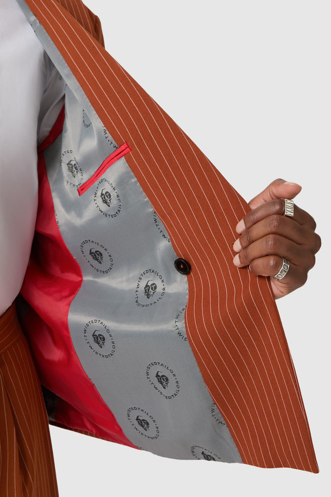 The Syrah oversized suit in rust is designed for the modern man who values both style and functionality. Its elegant pinstripe pattern and tailored fit make it perfect for any formal occasion, ensuring you look sharp and confident. The Syrah is the latest addition to the Twisted Tailor collection and is ideal for business meetings, weddings, or any formal event where you want to make a lasting impression. The double breasted jacket features a peak lapel, straight flap pockets, outer breast welt pockets and double darts. Pair the jacket with the matching straight leg trousers, both designed for a coordinated, polished look.
