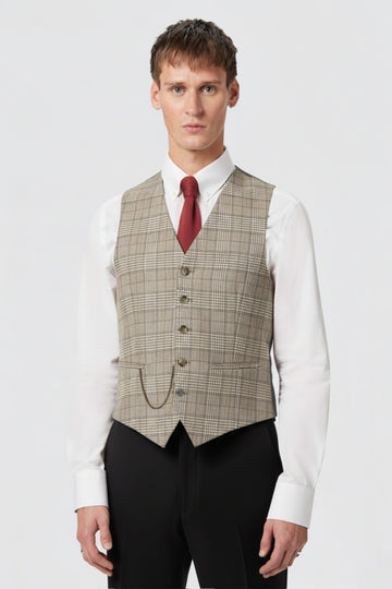 The Roy Light Brown Waistcoat channels timeless British sophistication, featuring a heritage Prince of Wales check in warm, earthy tones. A perfect nod to classic tailoring with a modern edge.