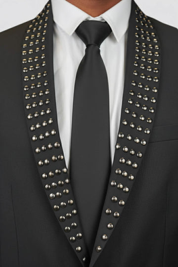 The Aubrey Black Suit gives classic tailoring a sharp, rebellious edge. Detailed with gunmetal studs across the lapel and pockets for a refined yet daring finish.