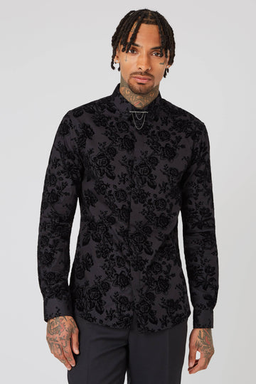 The Armando Shirt brings sleek rebellion to classic shirting, featuring all-over black floral flocking and a silver chain collar bar for a bold, elevated finish.