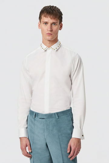 The Leigh Shirt redefines classic occasionwear. A crisp double cuff style elevated with gold studs around the collar for a sleek, rebellious finish.