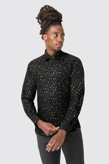 The Tarrow Shirt brings modern luxury to nightwear tailoring. Subtle black and gold flocked dots and gold metallic accents meet a gold collar bar for a sharp, refined edge.