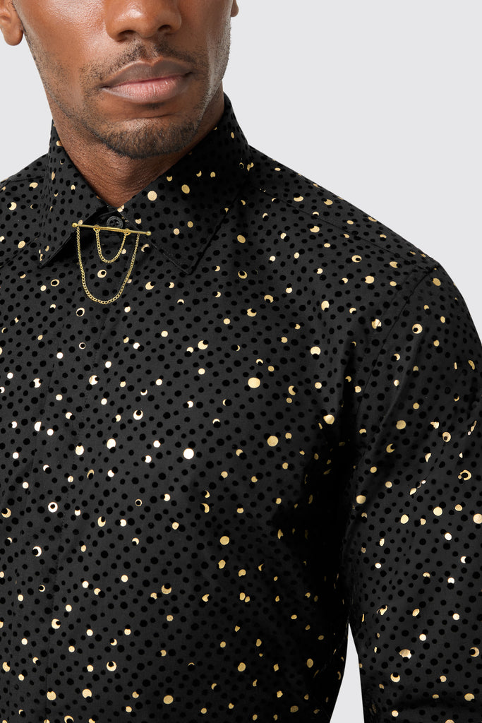Tarrow Slim Fit Black Flocked Dot Shirt with Gold Collar Bar Twisted Tailor