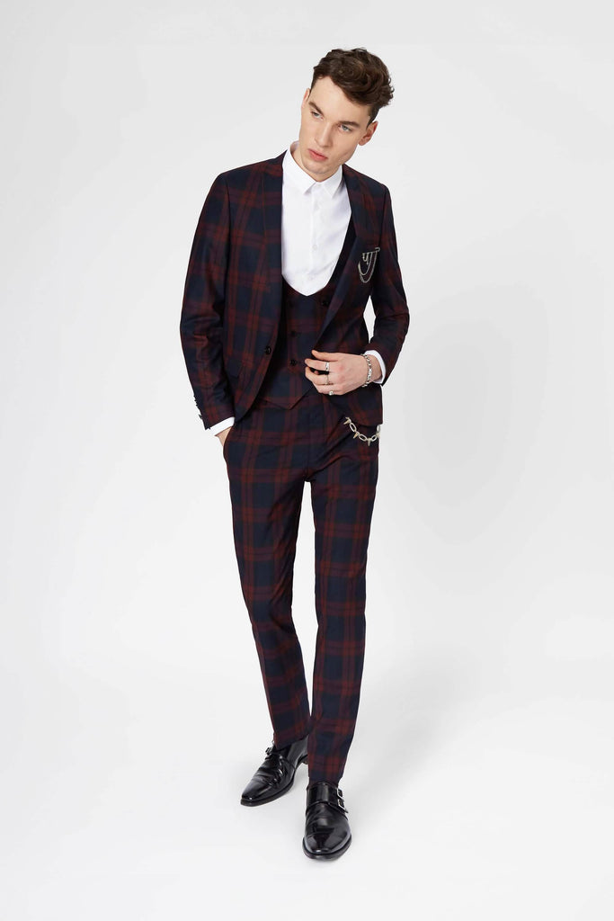 Viscous Skinny Fit Wine Tartan Suit with Chain Detail Twisted Tailor