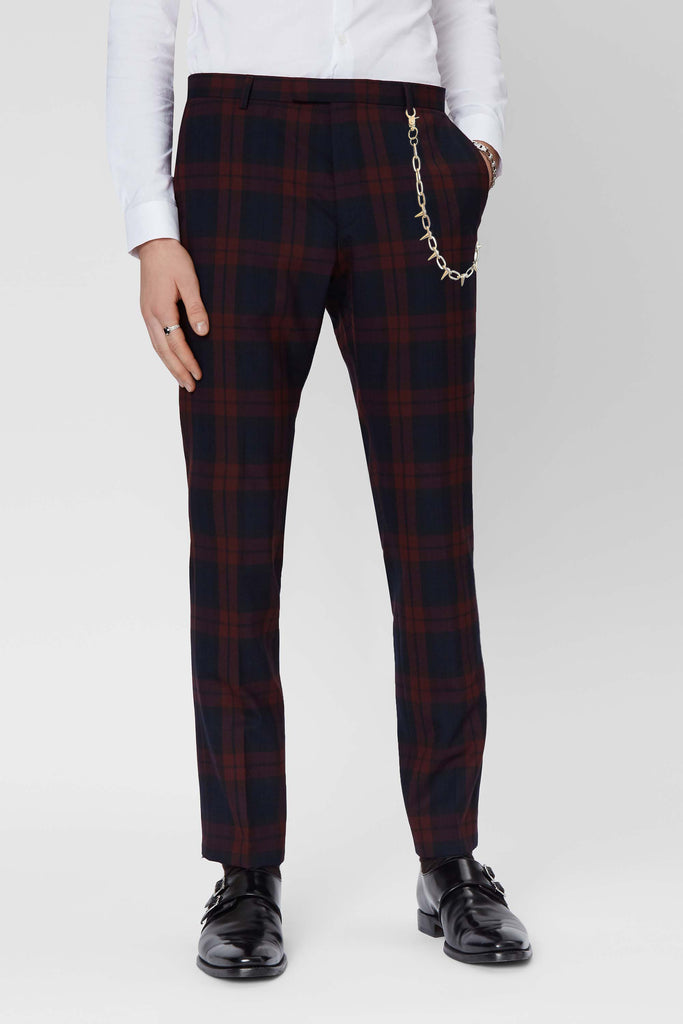Viscous Skinny Fit Wine Tartan Trousers with Chain Detail Twisted Tailor