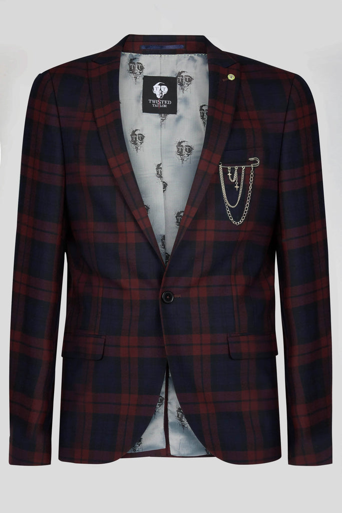Viscous Skinny Fit Wine Tartan Jacket with Chain Detail Twisted Tailor