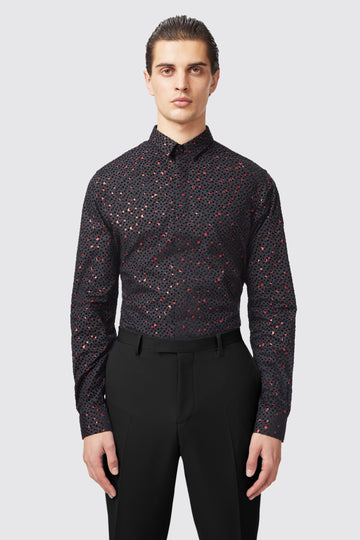 The Farrow shirt is a twisted take on a classic print. This skinny fit black shirt features a flocked black polka dot print layered on top of red foil spots; a contemporary take on sartorial dressing which will be a welcome addition to your formal wardrobe.