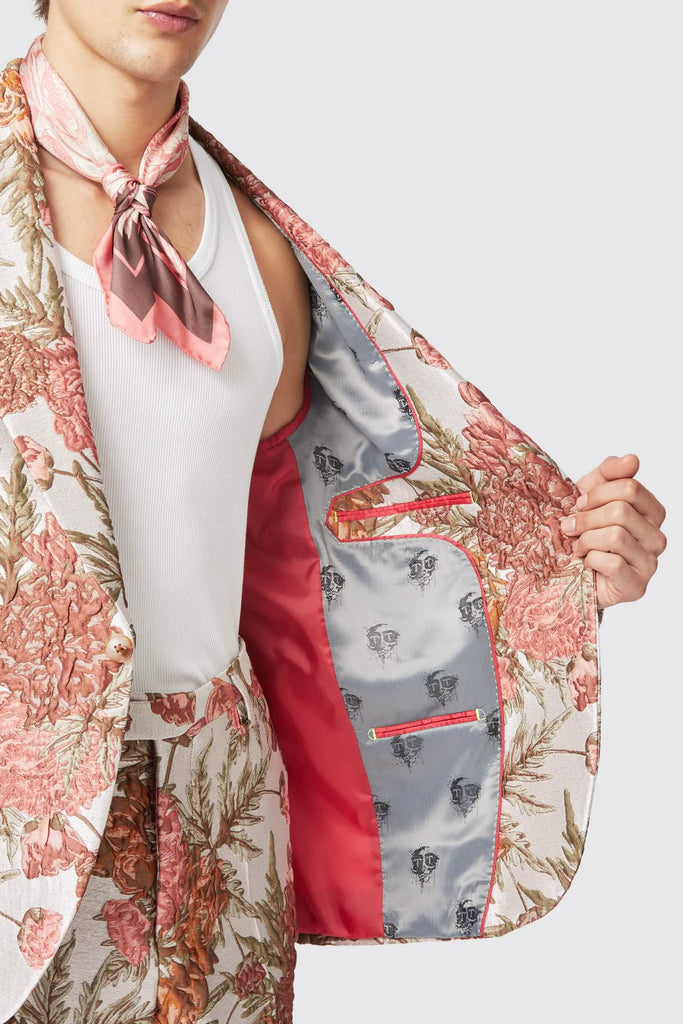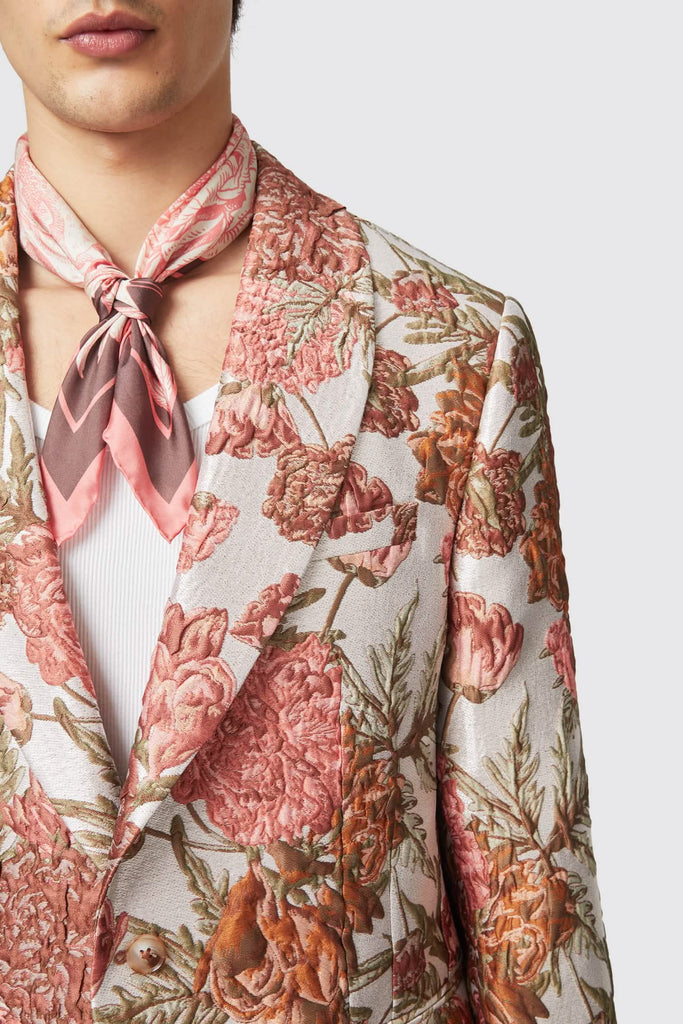 Introducing the Hirshfield Jacket in Silver - the perfect blend of high-fashion style and comfort. The peach floral jacquard adds a touch of elegance, while the shawl lapel and jet pockets keep the look modern. With a slim fit and double darts for a flattering silhouette, this jacket will have you feeling silver and stylish. Pair with the matching Hirshfield trousers and step out in full bloom.