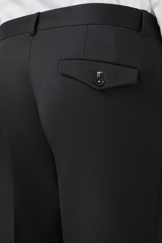 • Slim 3cm waistband, slanted belt loops, and rebellious touches like rose-threaded buttonholes, pink piping, and contrast stitching