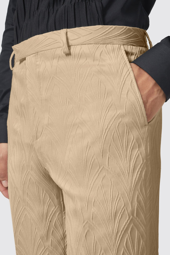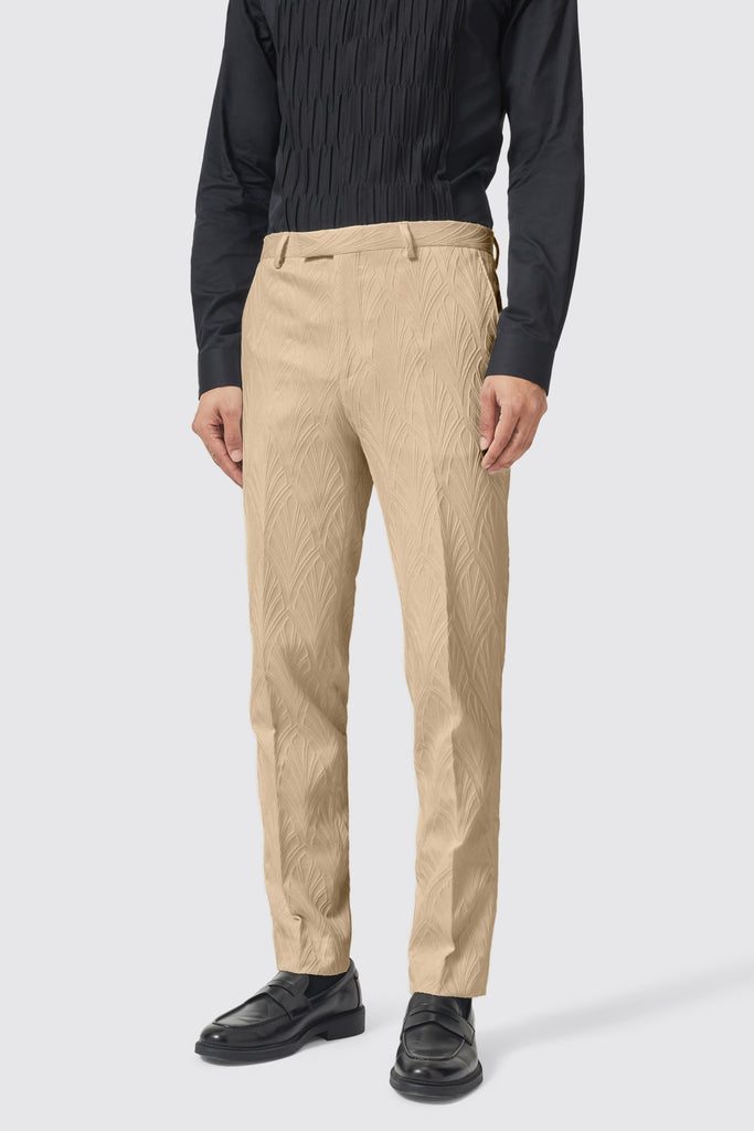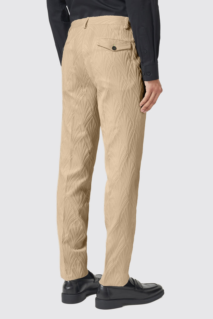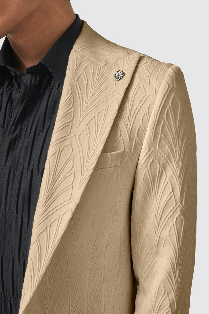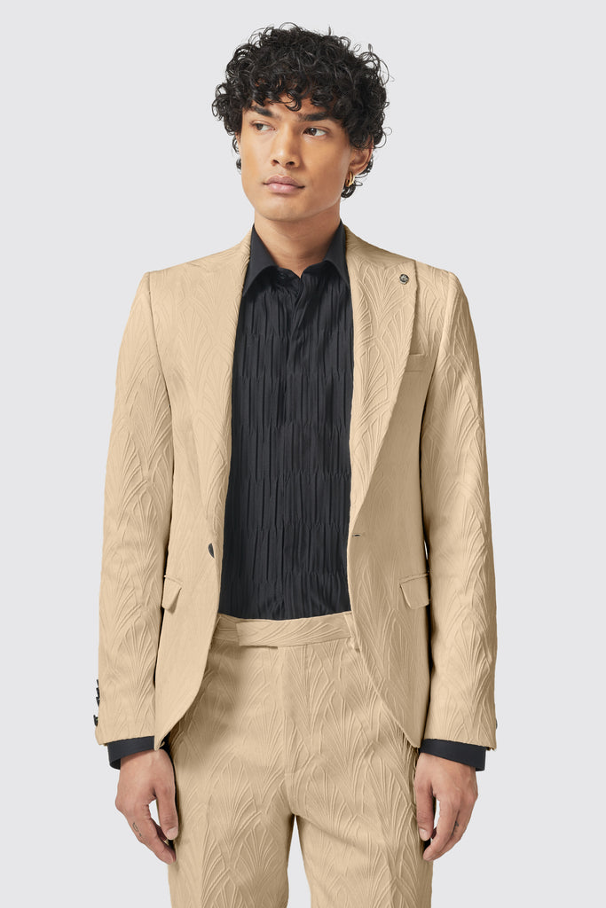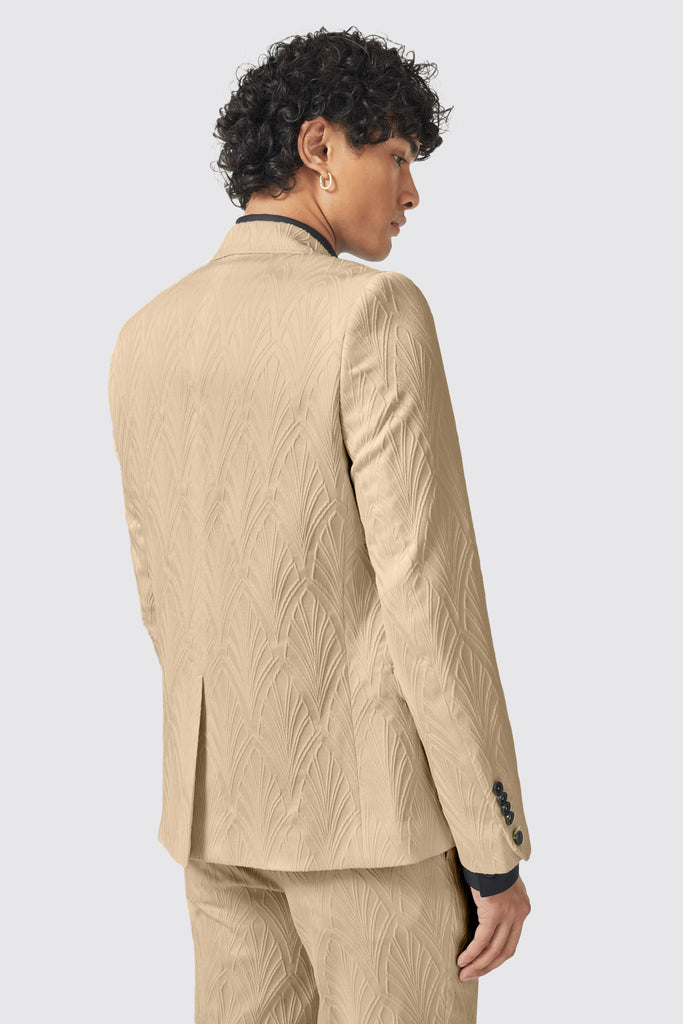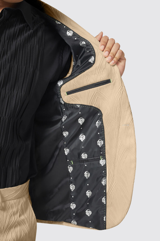 Say hello to the Makowski, the latest addition to the Twisted Tailor collection. The Makowski suit in beige features a peak lapel, straight flap pockets with kissing buttons on the sleeves. The matching trouser in beige is cut to our signature skinny fit and features slanted front pockets with belt loops. The suit is adorned with a jacquard print all over and can be worn day to night. Wear this suit to your next event or special occasion to be the talk of the party.