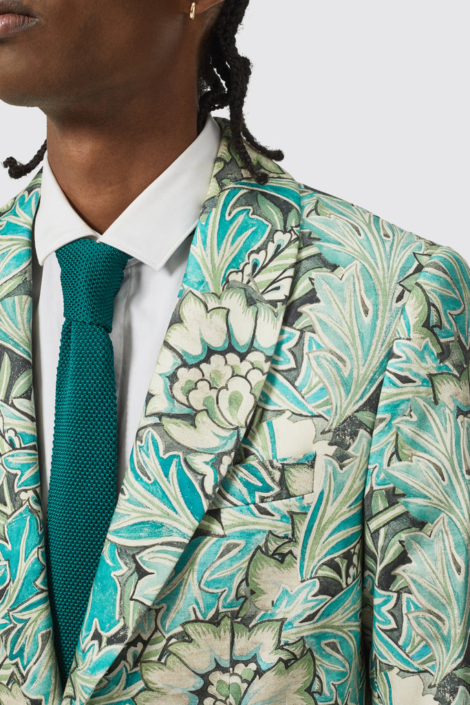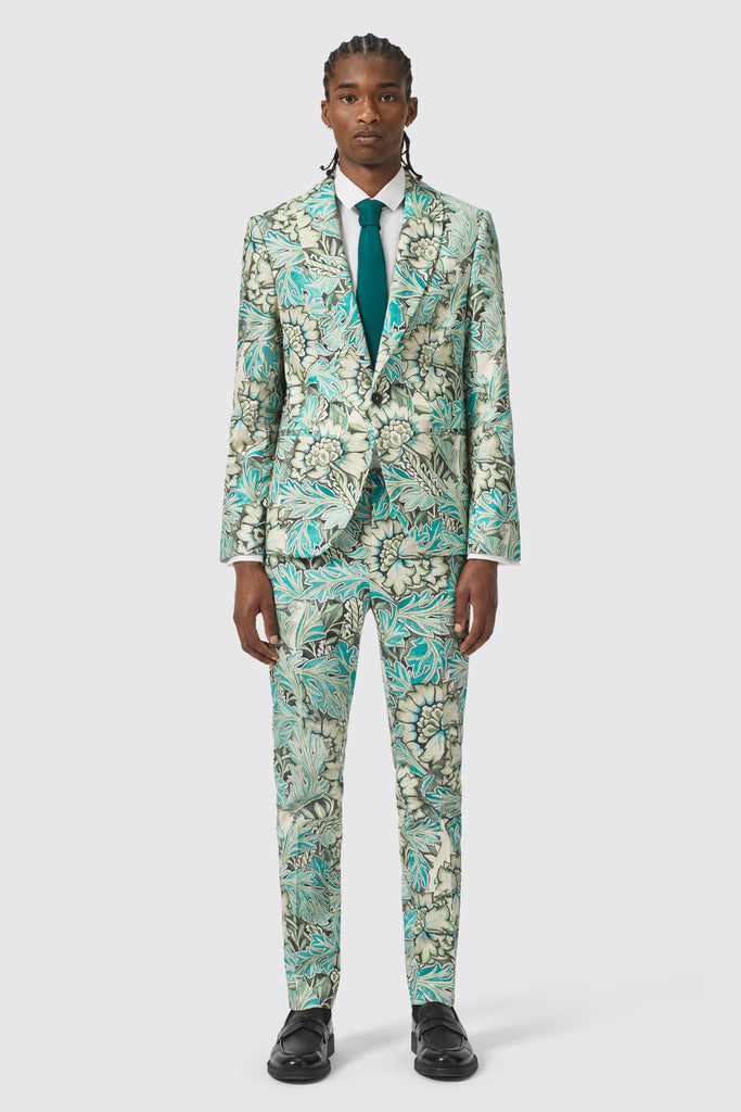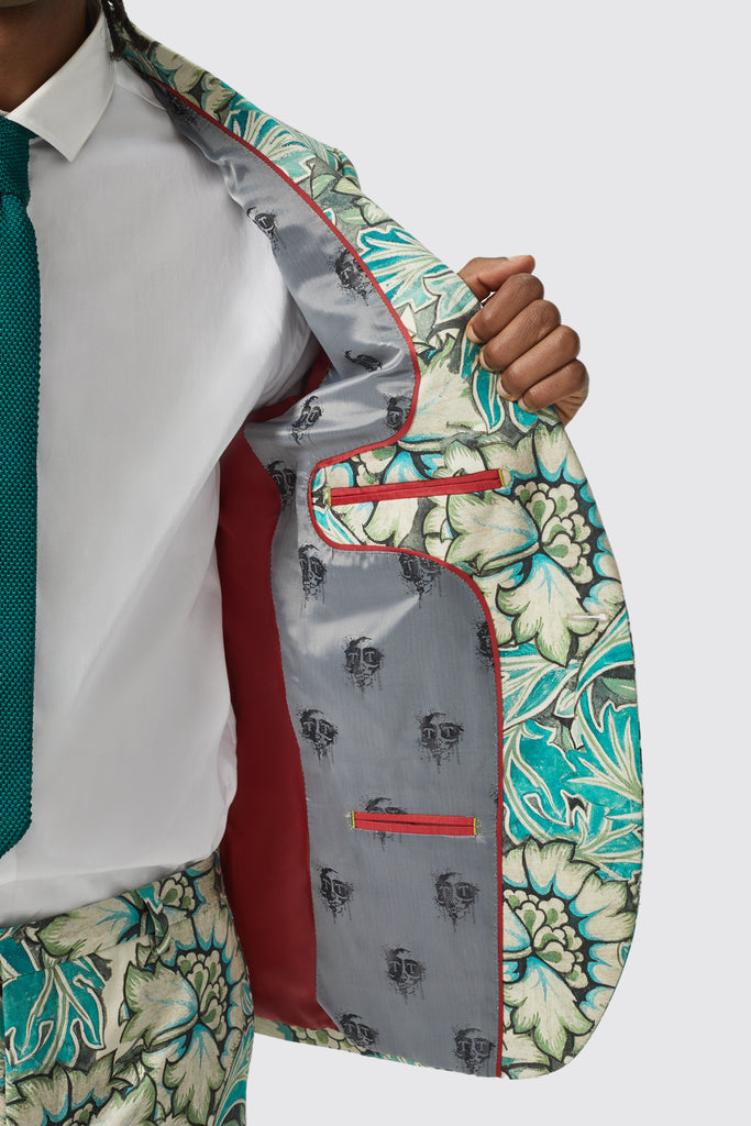 The Morris Jacket in green is adorned with a contrasting floral print all over. The jacket is cut to our signature slim fit and features a single button closure with kissing buttons on the sleeves.