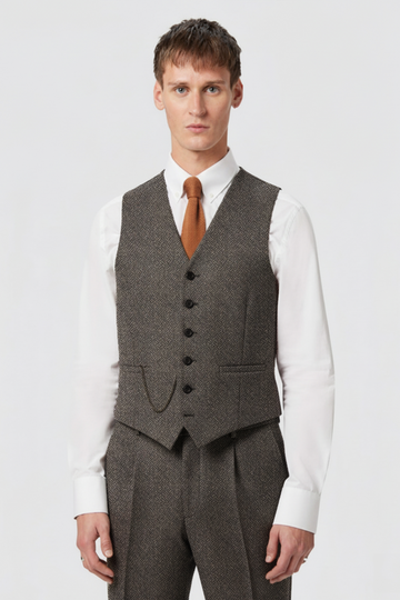 The Brookhouse Grey Waistcoat brings refined British tailoring to life, featuring a textured weave and signature chain detail for a sharp, heritage-inspired finish.